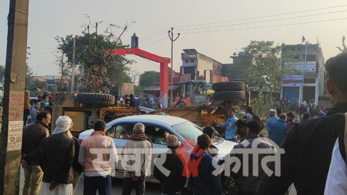 फ्लैग पोल लगाते समय पलटी क्रेन, हुआ हादसा