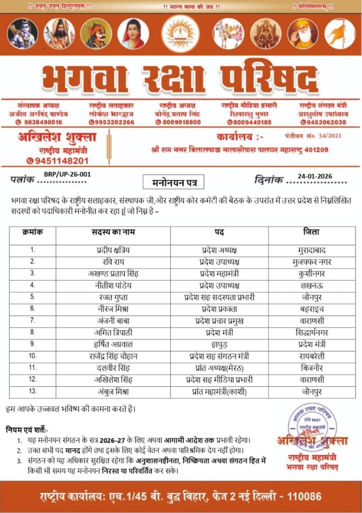 भगवा रक्षा परिषद के संस्थापक अरविंद अजीत पाण्डेय एवं राष्ट्रीय महामंत्री अखिलेश शुक्ला ने उनके कार्यों से संतुष्ट होकर उन्हें इस वर्ष प्रदेश महामंत्री के पद पर मनोनीत किया।