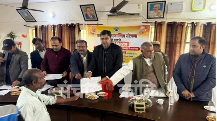 संचार क्रांति शोहरतगढ़: शोहरतगढ़ तहसील सभागार में शनिवार को प्रधानमंत्री स्वामित्व योजना के तहत मुख्य अतिथि शोहरतगढ़ विधायक विनय वर्मा व विशिष्ट अतिथि ब्लाक प्रमुख प्रतिनिधि अमित कुमार यादव ने गांव के नागरिकों के बीच ग्रामीण आवासीय अभिलेख घरौनी वितरण किया। और शोहरतगढ़ तहसील सभागार में बैठकर प्रधानमंत्री व मुख्यमंत्री के संबोधन को भी सुनकर व वर्चुअल कार्यक्रम का लोगों ने लाभ उठाया। शोहरतगढ़ विधायक विनय वर्मा ने कहा कि सरकार जनकल्याणकारी योजनाओं के माध्यम से लोगों को सुविधा प्रदान कर रही है। बिना भेदभाव के सरकार द्वारा हर वर्ग के लोगों को आवश्यक सुविधा मुहैया कराते हुये देश को विकास की ओर ले जाने के लिए सरकार कटिबंध है। और विधायक ने यह भी कहा कि उपलब्ध कराई गयी घरौनी में यदि किसी प्रकार की त्रुटि पाई जाती है तो उसे जिलाधिकारी के संज्ञान में लाकर सही कराने का प्रयास किया जाएगा। शोहरतगढ़ तहसील सभागार में विधायक विनय वर्मा, ब्लाक प्रमुख प्रतिनिधि अमित कुमार यादव, एसडीएम शोहरतगढ़ राहुल सिंह व तहसीलदार अजय कुमार ने औपचारिक रुप से ग्राम पंचायत खरगवार व चरिगवा के 100 नागरिकों को ग्रामीण आवासीय अभिलेख घरौनी उपलब्ध कराया विधायक ने कहा कि विधानसभा शोहरतगढ़ अंतर्गत तहसील शोहरतगढ़ के आबादी वाले सभी ग्रामों में ड्रोन सर्वेक्षण कार्य पूरा हो चुका है। सर्वेक्षण के बाद ग्रामीण आवासीय अभिलेख घरौनी वितरण शुरु हुआ है। एसडीएम शोहरतगढ़ राहुल सिंह ने कहा कि सर्वेक्षण उपरांत शोहरतगढ़ तहसील क्षेत्र के 214 गांव का अभिलेख तैयार हो चुका है जिसका वितरण खंड विकास अधिकारी व हल्का लेखपाल द्वारा भी शुरू कर दिया गया है। इस दौरान विधायक विनय वर्मा, ब्लाक प्रमुख प्रतिनिधि अमित कुमार यादव,एसडीएम राहुल सिंह, तहसीलदार अजय कुमार,नायब तहसीलदार महबूब अंसारी, खंड विकास अधिकारी यशोवर्धन सिंह, लेखपाल आशीष संगम, मुस्ताक अहमद,अनिरुद्ध चौधरी व रामजतन आदि लोग मौजूद रहे।