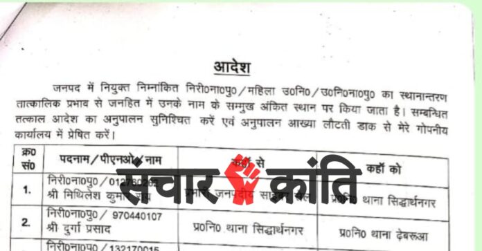संचारक्रान्ति संवाददाता सिद्धार्थनगर। पुलिस विभाग में प्रशासनिक मजबूती और कार्यप्रणाली को और प्रभावी बनाने के उद्देश्य से पुलिस अधीक्षक ने बड़ा फेरबदल करते हुए निरीक्षक, महिला उपनिरीक्षक एवं उपनिरीक्षकों सहित कुल 9 अधिकारियों के तबादले के आदेश जारी किए हैं। सभी अधिकारियों को तत्काल प्रभाव से नवीन तैनाती स्थल पर कार्यभार ग्रहण करने के निर्देश दिए गए हैं।