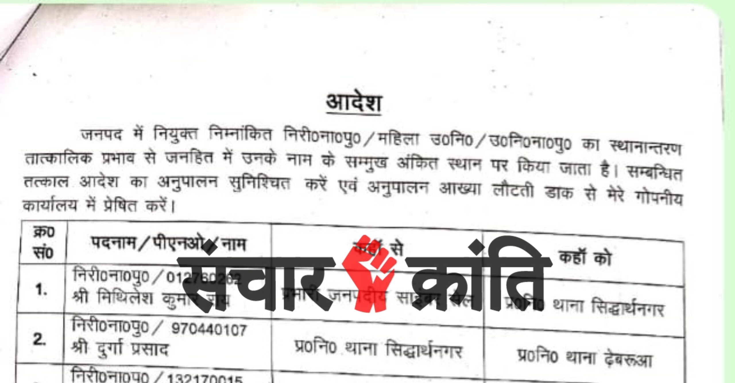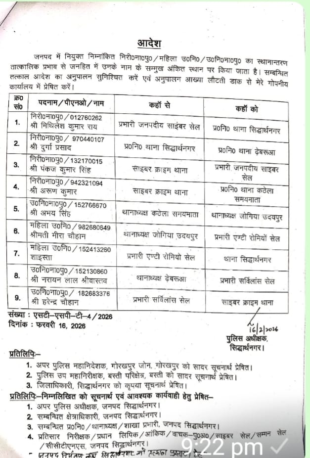 जारी आदेश के अनुसार प्रभारी जनपदीय साइबर सेल निरीक्षक मिथलेश कुमार राय को प्रभारी निरीक्षक थाना सिद्धार्थनगर की जिम्मेदारी सौंपी गई है। उपनिरीक्षक दुर्गा प्रसाद को थाना सिद्धार्थनगर से स्थानांतरित कर थाना ढेबरुआ भेजा गया है। वहीं साइबर क्राइम थाना में तैनात उपनिरीक्षक पंकज कुमार सिंह को प्रभारी जनपदीय साइबर सेल का दायित्व सौंपा गया है, जबकि उपनिरीक्षक अरुण कुमार को थाना कठेला समयमाता में नई तैनाती दी गई है।