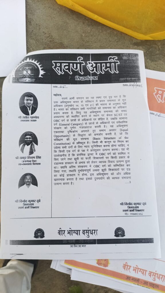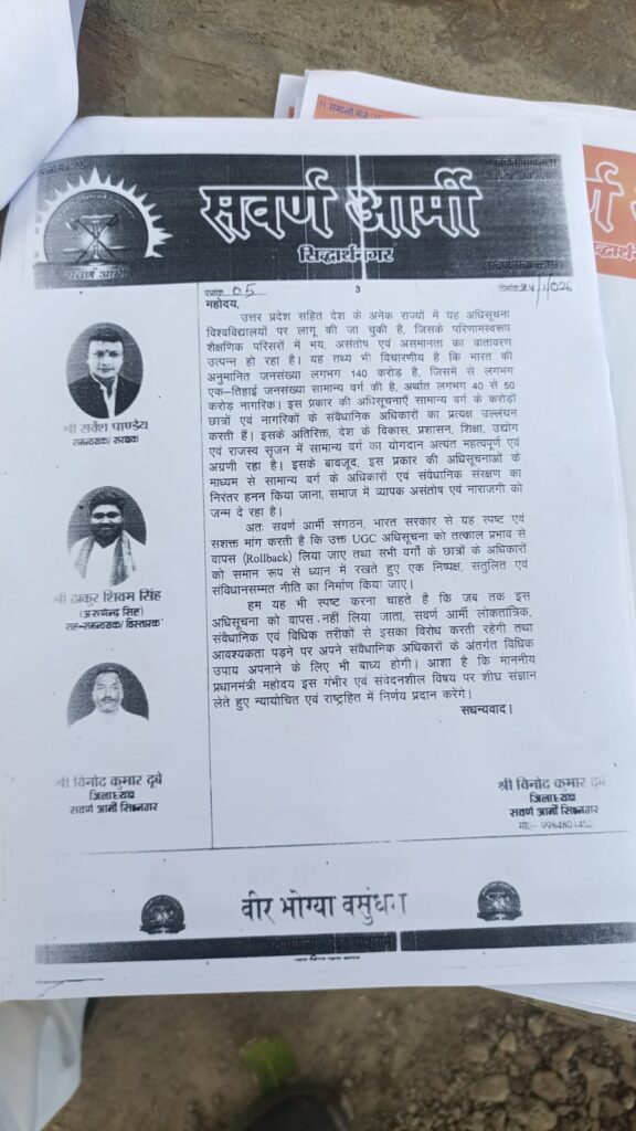 स्वर्ण आर्मी संगठन ने विश्वविद्यालय अनुदान आयोग (UGC) द्वारा जारी नई अधिसूचना को संविधान की भावना के विरुद्ध बताते हुए इसका कड़ा विरोध दर्ज कराया है। संगठन का कहना है कि यह अधिसूचना भारत के संविधान में प्रदत्त समानता के मूल अधिकारों का उल्लंघन करती है और इससे समाज में असंतोष एवं असमानता की भावना को बढ़ावा मिल रहा है।